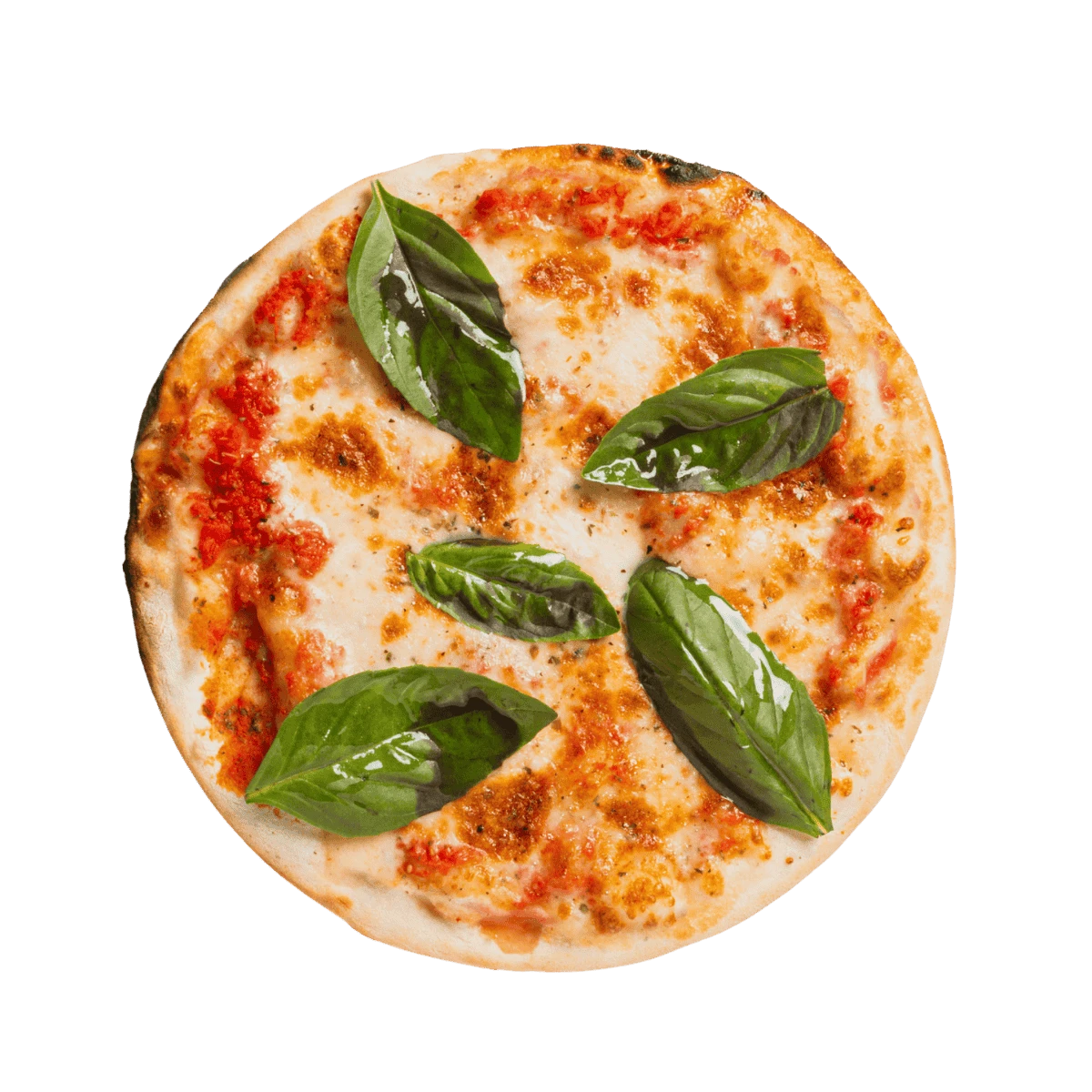 Una base fina y crujiente, salsa de tomate natural, mozzarella derretida y hojas frescas de albahaca que evocan los sabores clásicos de Italia.